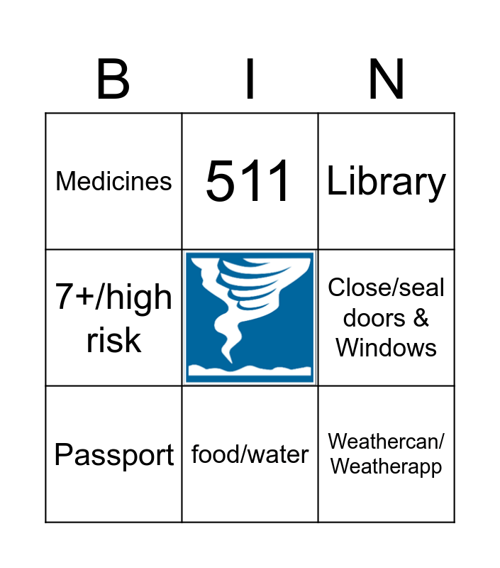 This bingo card has 1 images and 8 words: Passport, Library, 511, 7+/high risk, Medicines, Close/seal doors & Windows, Weathercan/ Weatherapp and food/water.