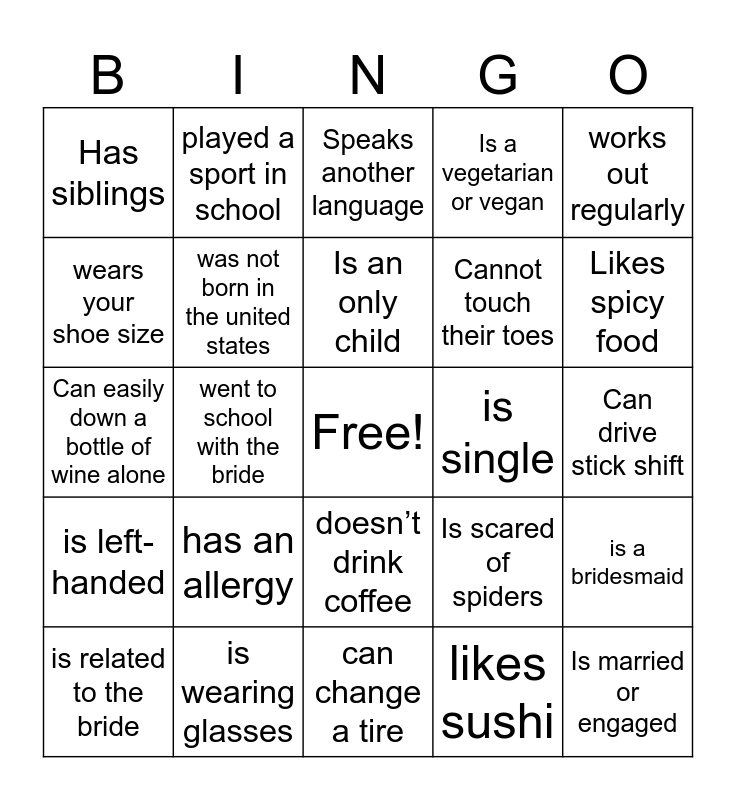 This bingo card has a free space and 24 words: has an allergy, is wearing glasses, Is an only child, is related to the bride, works out regularly, Has siblings, wears your shoe size, played a sport in school, is single, doesn’t drink coffee, Cannot touch their toes, Can easily down a bottle of wine alone, Is scared of spiders, is a bridesmaid, was not born in the united states, likes sushi, Can drive stick shift, Speaks another language, Likes spicy food, went to school with the bride, Is married or engaged, is left-handed, Is a vegetarian or vegan and can change a tire.