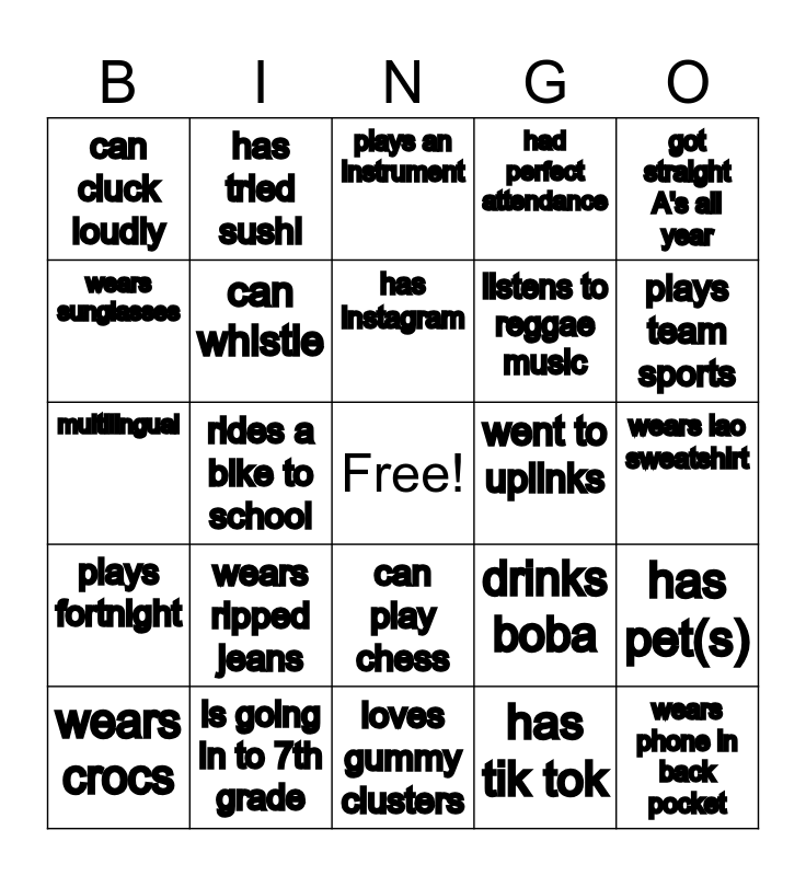 This bingo card has a free space and 24 words: wears ripped jeans, is going in to 7th grade, has instagram, wears crocs, got straight A's all year, can cluck loudly, wears sunglasses, has tried sushi, went to uplinks, can play chess, listens to reggae music, multilingual, drinks boba, has pet(s), can whistle, has tik tok, wears iao sweatshirt, plays an instrument, plays team sports, rides a bike to school, wears phone in back pocket, plays fortnight, had perfect attendance and loves gummy clusters.