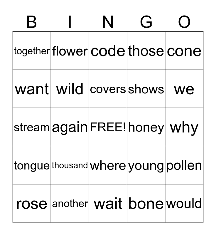 This bingo card has a free space and 24 words: thousand, another, covers, rose, cone, together, want, flower, honey, where, shows, stream, young, pollen, wild, bone, why, code, we, again, would, tongue, those and wait.