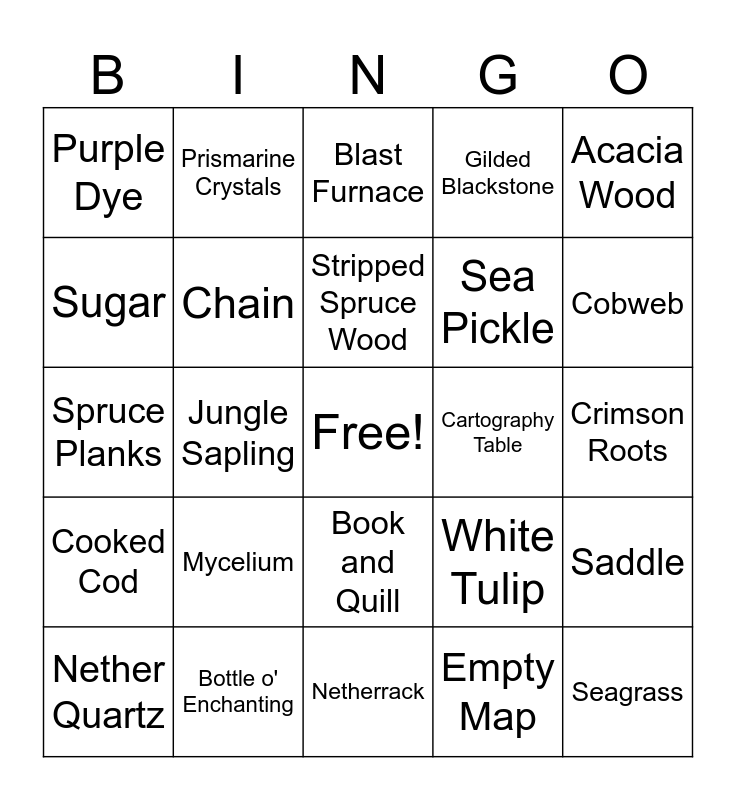 This bingo card has a free space and 403 words: Acacia Leaves, Acacia Log, Acacia Planks, Acacia Sapling, Acacia Wood, Allium, Amethyst Shard, Andesite, Apple, Armor Stand, Arrow, Azalea, Azure Bluet, Baked Potato, Bamboo, Banner, Barrel, Basalt, Beetroot, Beetroot Seeds, Beetroot Soup, Bell, Birch Leaves, Birch Log, Birch Planks, Birch Sapling, Birch Wood, Black Dye, Blackstone, Blast Furnace, Blaze Powder, Blaze Rod, Block of Amethyst, Blue Dye, Blue Orchid, Bone, Bone Block, Bone Meal, Book, Book and Quill, Bookshelf, Bottle o' Enchanting, Bow, Bowl, Enchanted Book, Bread, Brewing Stand, Brick, Bricks, Brown Dye, Brown Mushroom, Bucket, Bucket of Axolotl, Bucket of Cod, Bucket of Pufferfish, Bucket of Salmon, Bucket of Tadpole, Bucket of Tropical Fish, Buried Treasure Map, Cactus, Cake, Calcite, Calibrated Sculk Sensor, Campfire, Candle, Carrot, Cartography Table, Carved Pumpkin, Cauldron, Chain, Charcoal, Cherry Leaves, Cherry Log, Cherry Planks, Cherry Sapling, Cherry Wood, Chest, Clay, Clay Ball, Clock, Coal, Coarse Dirt, Cobbled Deepslate, Cobblestone, Cobweb, Cocoa Beans, Compass, Composter, Cooked Chicken, Cooked Cod, Cooked Mutton, Cooked Porkchop, Cooked Rabbit, Cooked Salmon, Cookie, Copper Ingot, Cornflower, Crafting Table, Crimson Fungus, Crimson Hyphae, Crimson Nylium, Crimson Planks, Crimson Roots, Crimson Stem, Crossbow, Crying Obsidian, Cut Copper, Cut Red Sandstone, Cut Sandstone, Cyan Dye, Dandelion, Dark Oak Leaves, Dark Oak Log, Dark Oak Planks, Dark Oak Sapling, Dark Oak Wood, Dark Prismarine, Daylight Detector, Dead Brain Coral, Dead Brain Coral Block, Dead Brain Coral Fan, Dead Bubble Coral, Dead Bubble Coral Block, Dead Bubble Coral Fan, Dead Bush, Dead Fire Coral, Dead Fire Coral Block, Dead Fire Coral Fan, Dead Horn Coral, Dead Horn Coral Block, Dead Horn Coral Fan, Dead Tube Coral, Dead Tube Coral Block, Dead Tube Coral Fan, Deepslate, Diamond, Diorite, Dirt, Dispenser, Dried Kelp, Dripstone Block, Dropper, Echo Shard, Egg, Emerald, Empty Map, Ender Pearl, Eye of Ender, Feather, Fermented Spider Eye, Fern, Fire Charge, Firework Rocket, Fishing Rod, Fletching Table, Flint, Flint and Steel, Flower Pot, Flowering Azalea, Furnace, Ghast Tear, Gilded Blackstone, Glass, Glass Bottle, Glass Pane, Glistering Melon Slice, Glow Berries, Glow Ink Sac, Glow Item Frame, Glow Lichen, Glowstone, Glowstone Dust, Goat Horn, Gold Ingot, Gold Nugget, Golden Apple, Golden Carrot, Granite, Gravel, Gray Bed, Carpet, Gray Dye, Green Bed, Green Dye, Grindstone, Gunpowder, Hanging Roots, Hay Bale, Heart of the Sea, Heavy Weighted Pressure Plate, Honey Bottle, Honeycomb, Hopper, Ink Sac, Iron Ingot, Iron Nugget, Item Frame, Jack o'Lantern, Jukebox, Jungle Leaves, Jungle Log, Jungle Planks, Jungle Sapling, Jungle Wood, Kelp, Ladder, Lantern, Lapis Lazuli, Large Fern, Lava Bucket, Lead, Leather, Leather Boots, Leather Cap, Leather Pants, Leather Tunic, Lectern, Lever, Light Blue Dye, Light Gray Dye, Light Weighted Pressure Plate, Lightning Rod, Lilac, Lily of the Valley, Lily Pad, Lime Dye, Loom, Magenta Dye, Wool, Magma Block, Magma Cream, Mangrove Leaves, Mangrove Log, Mangrove Propagule, Mangrove Roots, Mangrove Wood, Map, Melon Seeds, Melon Slice, Milk Bucket, Minecart, Moss Block, Moss Carpet, Mossy Cobblestone, Mud, Mushroom Stem, Mushroom Stew, Music Disc, Mycelium, Nautilus Shell, Nether Brick, Nether Bricks, Nether Quartz, Nether Wart, Netherrack, Note Block, Oak Leaves, Oak Log, Oak Planks, Oak Sapling, Oak Wood, Observer, Ominous Banner, Orange Dye, Orange Tulip, Oxeye Daisy, Packed Mud, Painting, Paper, Peony, Phantom Membrane, Pink Dye, Pink Petals, Pink Tulip, Piston, Pointed Dripstone, Poisonous Potato, Polished Andesite, Polished Basalt, Polished Blackstone, Polished Deepslate, Polished Diorite, Polished Granite, Poppy, Potato, Prismarine Crystals, Prismarine Shard, Pufferfish, Pumpkin, Pumpkin Pie, Pumpkin Seeds, Purple Dye, Rabbit Hide, Rabbit Stew, Rabbit's Foot, Rail, Raw Beef, Raw Chicken, Raw Cod, Raw Copper, Raw Gold, Raw Iron, Raw Mutton, Raw Porkchop, Raw Rabbit, Raw Salmon, Red Dye, Red Mushroom, Red Sand, Red Sandstone, Red Tulip, Redstone Dust, Redstone Lamp, Redstone Torch, Rooted Dirt, Rose Bush, Rotten Flesh, Saddle, Sand, Sandstone, Scaffolding, Scute, Sea Lantern, Sea Pickle, Seagrass, Shears, Shield, Grass, Shroomlight, Slimeball, Smithing Table, Smoker, Smooth Basalt, Smooth Red Sandstone, Smooth Sandstone, Smooth Stone, Snow, Snow Block, Snowball, Soul Sand, Soul Soil, Spectral Arrow, Spider Eye, Sponge, Spruce Leaves, Spruce Log, Spruce Planks, Spruce Sapling, Spruce Wood, Spyglass, Steak, Stick, Stone, Stonecutter, String, Stripped Acacia Log, Stripped Acacia Wood, Stripped Birch Log, Stripped Birch Wood, Stripped Cherry Log, Stripped Cherry Wood, Stripped Crimson Hyphae, Stripped Crimson Stem, Stripped Dark Oak Log, Stripped Dark Oak Wood, Stripped Jungle Log, Stripped Jungle Wood, Stripped Mangrove Log, Stripped Mangrove Wood, Stripped Oak Log, Stripped Oak Wood, Stripped Spruce Log, Stripped Spruce Wood, Stripped Warped Hyphae, Stripped Warped Stem, Sugar, Sugar Cane, Sunflower, Suspicious Stew, Sweet Berries, Tall Grass, Target, Terracotta, TNT, Torch, Tripwire Hook, Tropical Fish, Tuff, Twisting Vines, Vines, Warped Fungus, Warped Planks, Warped Stem, Water Bucket, Weeping Vines, Wet Sponge, Wheat, Wheat Seeds, White Dye, White Tulip, Written Book, Yellow Dye and Water Bottle.