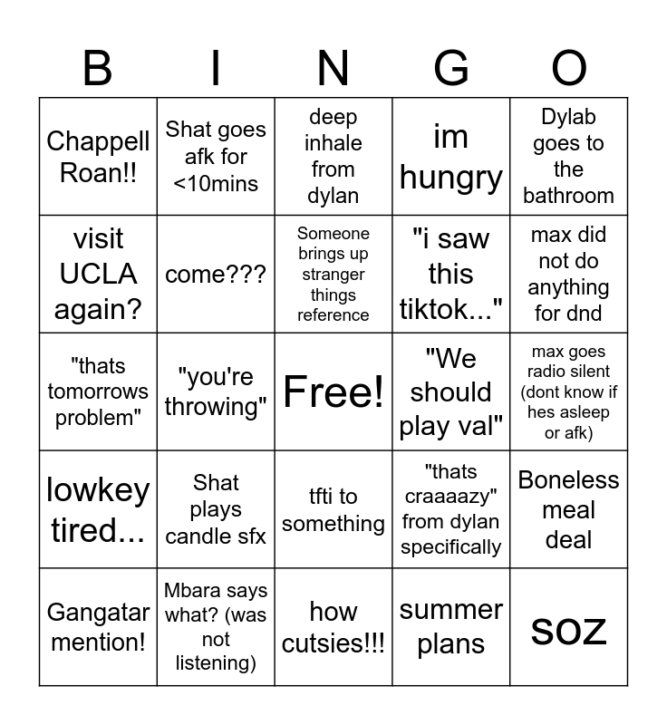 This bingo card has a free space and 24 words: Shat plays candle sfx, Mbara says what? (was not listening), Someone brings up stranger things reference, Gangatar mention!, Dylab goes to the bathroom, Chappell Roan!!, visit UCLA again?, Shat goes afk for <10mins, "We should play val", tfti to something, "i saw this tiktok...", "thats tomorrows problem", "thats craaaazy" from dylan specifically, Boneless meal deal, come???, summer plans, max goes radio silent (dont know if hes asleep or afk), deep inhale from dylan, max did not do anything for dnd, "you're throwing", soz, lowkey tired..., im hungry and how cutsies!!!.