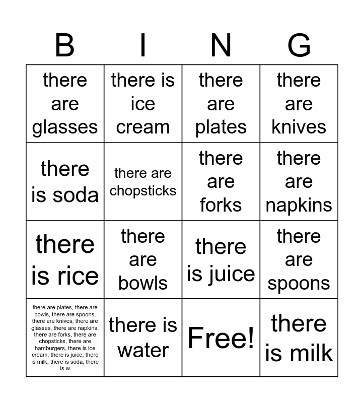 This bingo card has 17 words: Free!, there are plates, there are bowls, there are spoons, there are knives, there are glasses, there are napkins, there are forks, there are chopsticks, there are hamburgers, there is ice cream, there is juice, there is milk, there is soda, there is w, there are plates, there are glasses, there are bowls, there are knives, there are spoons, there are forks, there are napkins, there are chopsticks, there is water, there is juice, there is soda, there is ice cream, there is rice, there are hamburgers and there is milk.