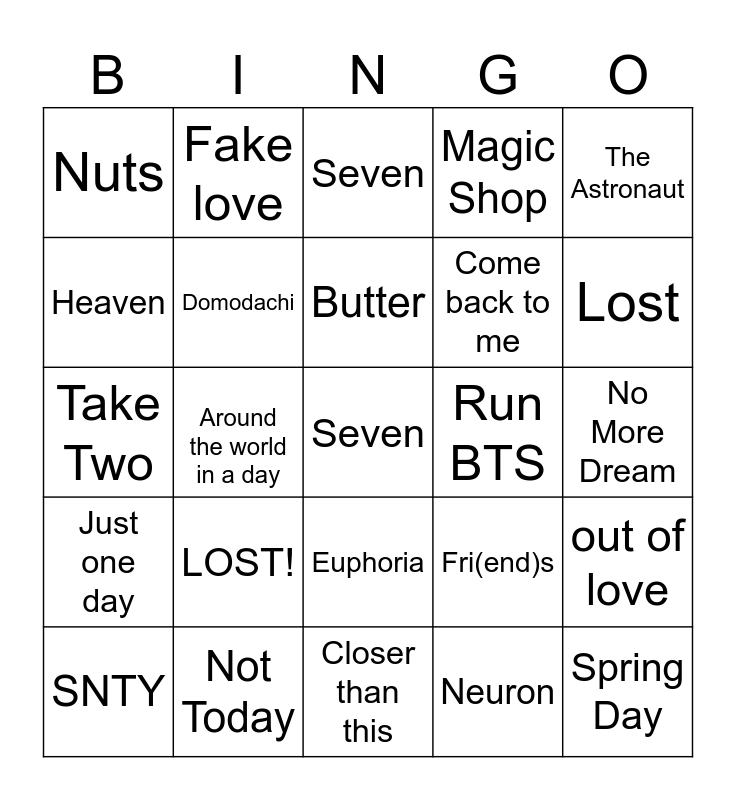 This bingo card has a free space and 24 words: LOST!, Not Today, Butter, SNTY, The Astronaut, Nuts, Heaven, Fake love, Run BTS, Euphoria, Come back to me, Take Two, Fri(end)s, out of love, Domodachi, Neuron, No More Dream, Seven, Lost, Around the world in a day, Spring Day, Just one day, Magic Shop and Closer than this.