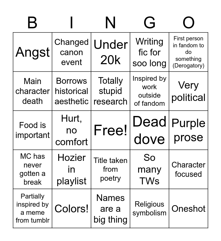 This bingo card has a free space and 24 words: Hozier in playlist, Colors!, Totally stupid research, Partially inspired by a meme from tumblr, First person in fandom to do something (Derogatory), Angst, Main character death, Changed canon event, Dead dove, Title taken from poetry, Inspired by work outside of fandom, Food is important, So many TWs, Character focused, Borrows historical aesthetic, Religious symbolism, Purple prose, Under 20k, Very political, Hurt, no comfort, Oneshot, MC has never gotten a break, Writing fic for soo long and Names are a big thing.