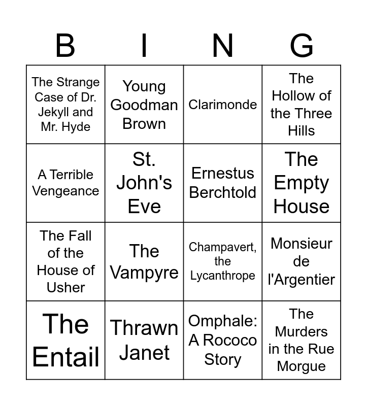 This bingo card has 16 words: Thrawn Janet, Monsieur de l'Argentier, Clarimonde, The Strange Case of Dr. Jekyll and Mr. Hyde, The Fall of the House of Usher, Young Goodman Brown, Champavert, the Lycanthrope, Omphale: A Rococo Story, A Terrible Vengeance, St. John's Eve, The Entail, The Hollow of the Three Hills, The Vampyre, The Empty House, Ernestus Berchtold and The Murders in the Rue Morgue.