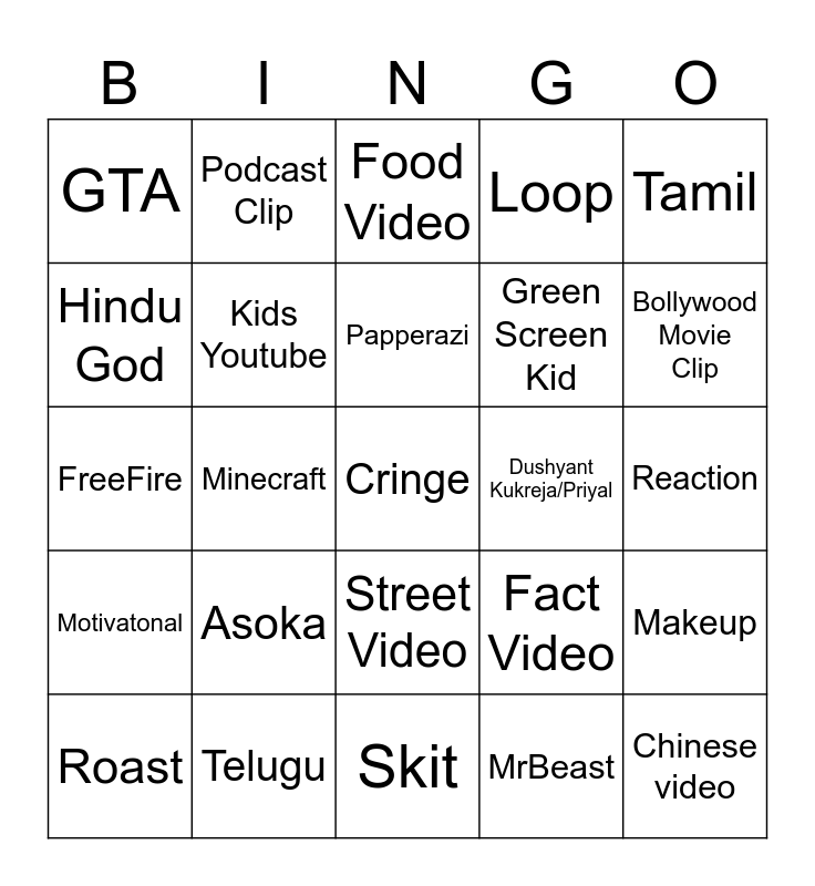 This bingo card has a free space and 24 words: Asoka, Telugu, Papperazi, Roast, Tamil, GTA, Hindu God, Podcast Clip, Dushyant Kukreja/Priyal, Street Video, Green Screen Kid, FreeFire, Fact Video, Makeup, Kids Youtube, MrBeast, Reaction, Food Video, Bollywood Movie Clip, Minecraft, Chinese video, Motivatonal, Loop and Skit.