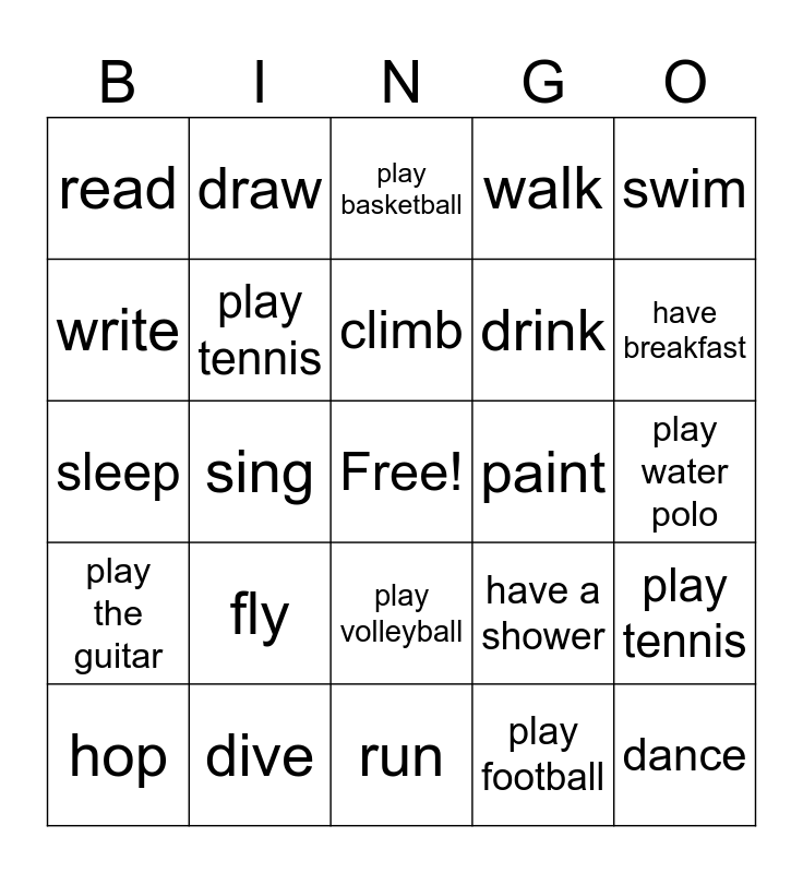 This bingo card has a free space and 24 words: fly, dive, climb, hop, swim, read, write, draw, paint, play volleyball, drink, sleep, have a shower, play tennis, play tennis, play football, play water polo, play basketball, have breakfast, sing, dance, play the guitar, walk and run.