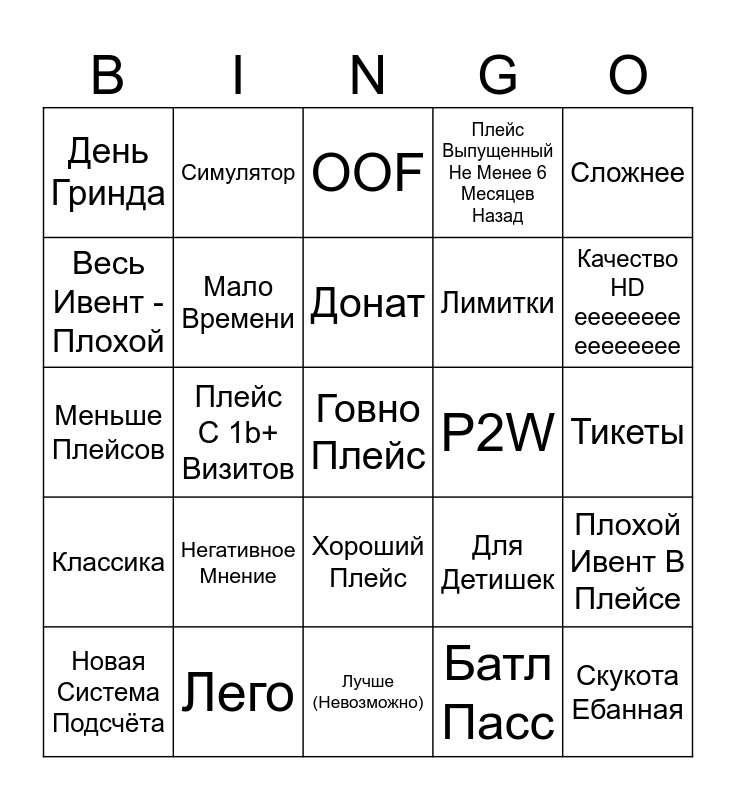 This bingo card has a free space and 24 words: Негативное Мнение, Лего, Донат, Новая Система Подсчёта, Сложнее, День Гринда, Весь Ивент - Плохой, Симулятор, P2W, Хороший Плейс, Лимитки, Меньше Плейсов, Для Детишек, Плохой Ивент В Плейсе, Мало Времени, Батл Пасс, Тикеты, OOF, Качество HD ееееееее ееееееее, Плейс С 1b+ Визитов, Скукота Ебанная, Классика, Плейс Выпущенный Не Менее 6 Месяцев Назад and Лучше (Невозможно).