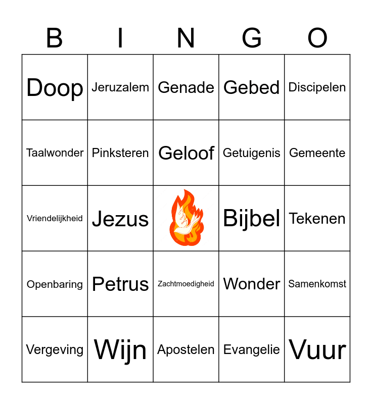 This bingo card has a free space and 51 words: Heilige Geest, Vuur, Wind, Apostelen, Petrus, Johannes, Jeruzalem, Tongen van vuur, Taalwonder, Drieduizend mensen, Pinksteren, Gebed, Samenkomst, Wonder, Vreugde, Vrede, Geloof, Bijbel, Lofprijzing, Discipelen, Jezus, Evangelie, Doop, Getuigenis, Prediking, Kerk, Gemeente, Christenen, Vergeving, Genade, Hemelvaart, Opstanding, Profetie, Liefde, Brood, Wijn, Redding, Apostel Paulus, Barmhartigheid, Gaven, Tekenen, Openbaring, Jezus Christus, Aanbidding, Verbond, Drie-eenheid, Vriendelijkheid, Goedheid, Trouw, Zachtmoedigheid and Zelfbeheersing.