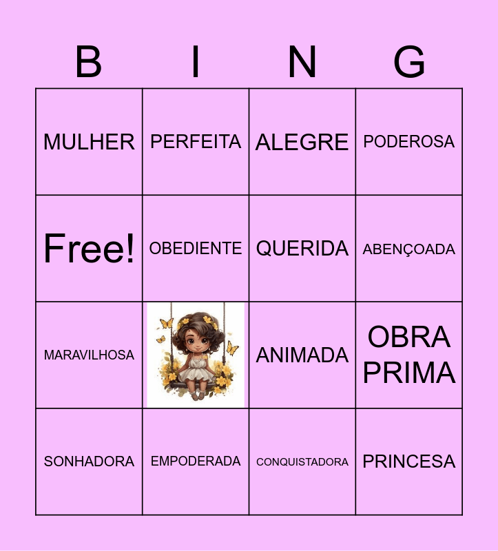 This bingo card has 5 images and 35 words: BONITA, ANIMADA, VIRTUOSA, QUERIDA, MEIGA, FILHA AMADA, ABENÇOADA, CORAJOSA, Free!, PRINCESA, OBRA PRIMA, PODEROSA, SONHADORA, CONQUISTADORA, EMPODERADA, PRECIOSA, CARINHOSA, MULHER, FIEL, ALEGRE, LINDA, AMIGA, MARAVILHOSA, OBEDIENTE, PROATIVA, EM BRANCO, EM BRANCO, EM BRANCO, EM BRANCO, EM BRANCO, DESCENTE, CONSELHEIRA, VALENTE, PERFEITA and ELEGANTE.