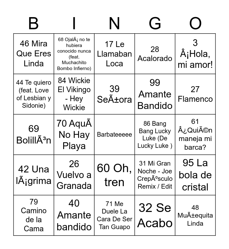 This bingo card has a free space and 105 words: 1 Cuando Zarpa El Amor, 2 Y Como Es El (made popular by Marc Anthony) [vocal version], 3 ¡Hola, mi amor!, 4 Lucha De Gigantes, 5 HOY NO ME PUEDO LEVANTAR - VERSION, 6 No hay marcha en Nueva York, 7 Como Yo Te Amo, 8 Frente a frente (feat. Tulsa), 9 Hey!, 10 La Caza, 11 Chas! Y Aparezco A Tu Lado, 12 Pena, Penita, Pena!, 13 Mi Carro, 14 Mi Gran Noche, 15 Esta CobardÃa, 16 Amigo, 17 Le Llamaban Loca, 18 Nada de Nada, 19 Me Quedo Contigo [Si Me Das A Elegir], 20 Fiesta - En Directo en Madrid 2020, 21 Porque Te Vas..., 22 HeroÃna, 23 Rata de Dos Patas, 24 Bésame mucho, 25 Corazón Contento, 26 Vuelvo a Granada, 27 Flamenco, 28 Acalorado, 29 Soy Rebelde, 30 Me Olvide de Vivir, 31 Mi Gran Noche - Joe Crepúsculo Remix / Edit, 32 Se Acabo, 33 La Chatunga, 34 Te Estoy Queriendo Tanto, 35 Vivir Asi es Morir de Amor, 36 Agapimú (feat. Ana Belén), 37 Yo No Soy Esa, 38 Un beso y una flor, 39 Señora, 40 Amante bandido, 41 Mediterráneo, 42 Una lágrima, 43 Procuro olvidarte, 44 Te quiero (feat. Love of Lesbian y Sidonie), 45 Porque Te Vas, 46 Mira Que Eres Linda, 47 Soy Un Truhan, Soy Un Señor, 48 Muñequita Linda, 49 Señora, 50 Yo No Soy Esa, 51 Porque te vas, 52 La Gata Bajo la Lluvia, 53 Eres Tú, 54 Historia de un amor, 55 A Tu Vera, 56 Mujer Contra Mujer, 57 Porque Te Vas, 58 Gracias a la Vida - with Miri Ros, 59 InvÃtame A Un Café, 60 Oh, tren, 61 ¿Quién maneja mi barca?, 62 Soy Un Truhán, Soy Un Señor, 63 Mi Niño No Quiere Dormir, 64 Verbena, 65 A Santiago Voy, 66 A-Ba-Ni-Bi, 67 Quiero Verte, 68 Ojalá no te hubiera conocido nunca (feat. Muchachito Bombo Infierno), 69 Bolillón, 70 Aquà No Hay Playa, 71 Me Duele La Cara De Ser Tan Guapo, 72 Gitana Hechicera, 73 Son Ilusiones - Single Version, 74 Sobreviviré, 75 La flaca, 76 Pajaros de Barro, 77 Veneno en la Piel, 78 Entre dos tierras, 79 Camino de la Cama, 80 Como una Ola, 81 Punto De Partida (with Monica Naranjo), 82 The Ketchup Song (Aserejé) - Spanish Version, 83 D' Artacán y los Tres Mosqueperros, 84 Wickie El Vikingo - Hey Wickie, 85 Inspector Gadget, 86 Bang Bang Lucky Luke (De Lucky Luke ), 87 Los Fruittis, 88 Popeye, 89 Fraguel Rock, 90 Mil Calles Llevan Hacia Ti, 91 1.000 Pedazos, 92 Estoy Por Ti, 93 Como Un Burro Amarrado En La Puerta Del Baile - Remastered, 94 Pippi Calzaslargas, 95 La bola de cristal, 96 Yo No Te Pido La Luna, 97 ¡Chas! Y aparezco a tu lado, 98 Comando G, 99 Amante Bandido, 100 Mi gran noche, 101 La Dosis Perfecta, 102 Salta!!!, 103 Yo Quiero Bailar, 104 Sabor de amor and 105 Quiero tener tu presencia.