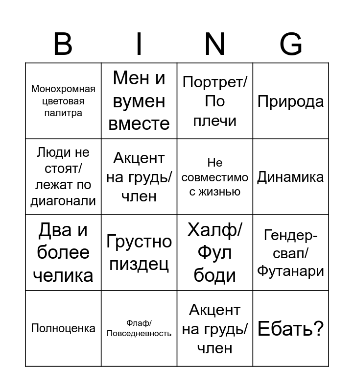 This bingo card has 20 words: Гендер-свап/Футанари, Есть чёрный цвет, Портрет/По плечи, Мейдочки/Банисьюты, Полноценка, Люди не стоят/лежат по диагонали, Флаф/Повседневность, Монохромная цветовая палитра, Два и более челика, Мен и вумен вместе, Грустно пиздец, Халф/Фул боди, Акцент на грудь/член, Ебать?, Не совместимо с жизнью, Есть женщина (не важно какая), Динамика, Природа, Акцент на грудь/член and Полноценка.