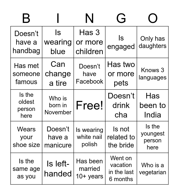 This bingo card has a free space and 27 words: Is not related to the bride, Travelled one hour to get here, Has two or more pets, Has been married 10+ years, Has met someone famous, Has 3 or more children, Is wearing blue, Wears your shoe size, Doesn’t drink cha, Is the youngest person here, Is the oldest person here, Is engaged, Is the same age as you, Is left-handed, Knows 3 languages, Is wearing contact lenses, Can change a tire, Doesn’t have Facebook, Doesn’t have a manicure, Doesn’t have a handbag, Has been to India, Went on vacation in the last 6 months, Who is born in November, Who is a vegetarian, Is wearing white nail polish, Only has daughters and Only has sons.
