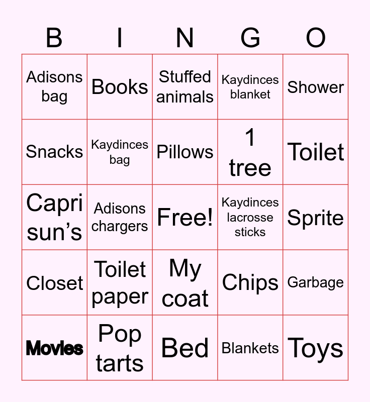 This bingo card has a free space and 24 words: Movies, Toilet paper, Pillows, Blankets, Shower, Adisons bag, Books, Stuffed animals, Kaydinces lacrosse sticks, Sprite, Capri sun’s, Kaydinces bag, Chips, Garbage, Snacks, Pop tarts, Bed, Kaydinces blanket, Toilet, Closet, Adisons chargers, My coat, 1 tree and Toys.