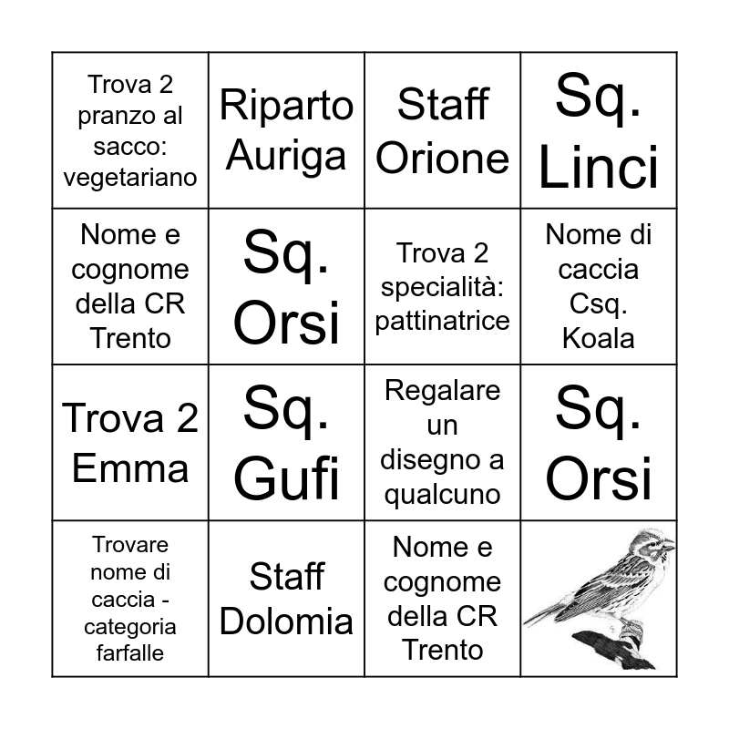 ⚠ This card has duplicate items: Trova nome di caccia: Meticoloso (2), Trova 2 ambulanziere (2), Trova 2 specialità: pattinatrice (2), Trova 5 Chiara (2), Trova 2 Emma (2), Riparto Auriga (2), Sq. Linci (2), Sq. Scoiattoli (2), Sq. Orsi (2), Alta Sq. Castori (2), Regalare un disegno a qualcuno (2), Trova 2 pranzo al sacco: vegetariano (2), Trovare nome di caccia - categoria farfalle (2), Nome e cognome della CR Trento (2), Nome di caccia Csq. Orsi (2), Nome di caccia Csq. Koala (2), Staff Dolomia (2), Staff Orione (2), Trova 5 persone alte almeno 1,70m (2)