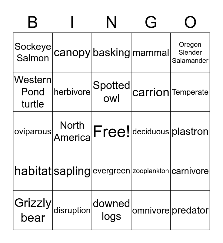 This bingo card has a free space and 24 words: sapling, disruption, Spotted owl, Grizzly bear, Oregon Slender Salamander, Sockeye Salmon, Western Pond turtle, canopy, deciduous, evergreen, carrion, oviparous, zooplankton, carnivore, herbivore, omnivore, plastron, basking, Temperate, North America, predator, habitat, mammal and downed logs.