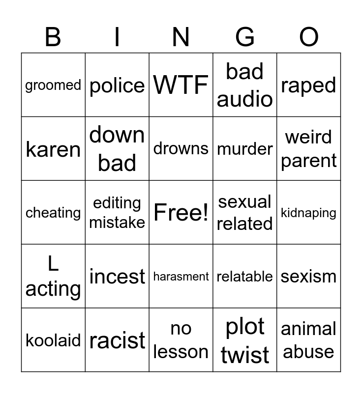 This bingo card has a free space and 24 words: incest, racist, drowns, koolaid, raped, groomed, karen, police, sexual related, harasment, murder, cheating, relatable, sexism, down bad, plot twist, kidnaping, WTF, weird parent, editing mistake, animal abuse, L acting, bad audio and no lesson.