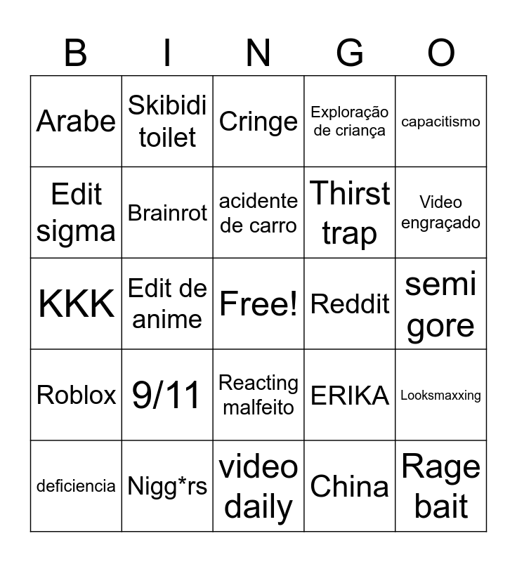 This bingo card has a free space and 24 words: 9/11, Nigg*rs, acidente de carro, deficiencia, capacitismo, Arabe, Edit sigma, Skibidi toilet, Reddit, Reacting malfeito, Thirst trap, KKK, ERIKA, Looksmaxxing, Brainrot, China, semi gore, Cringe, Video engraçado, Edit de anime, Rage bait, Roblox, Exploração de criança and video daily.