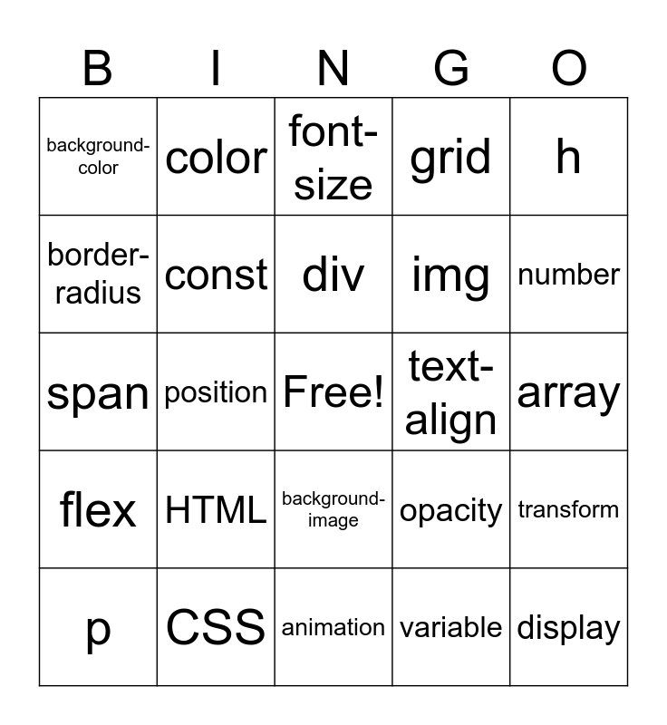 This bingo card has a free space and 24 words: HTML, CSS, div, p, h, background-color, border-radius, color, text-align, background-image, img, span, opacity, transform, const, variable, array, font-size, number, position, display, flex, grid and animation.