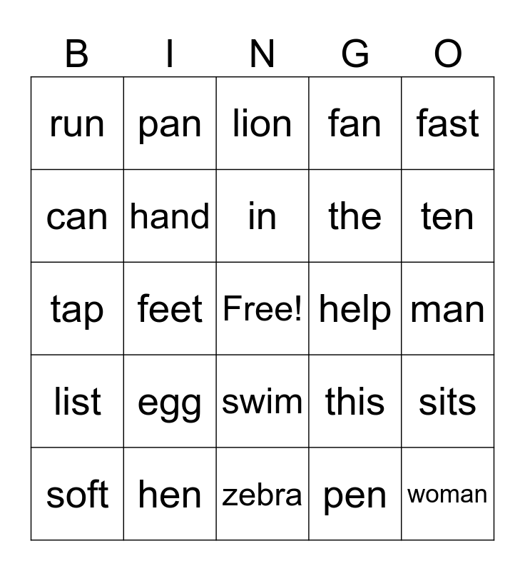 This bingo card has a free space and 29 words: soft, milk, feet, jump, run, lion, hand, egg, help, hen, man, woman, zebra, pen, ten, wet, swim, list, fast, tap, this, that, the, can, fan, pan, sits, in and on.