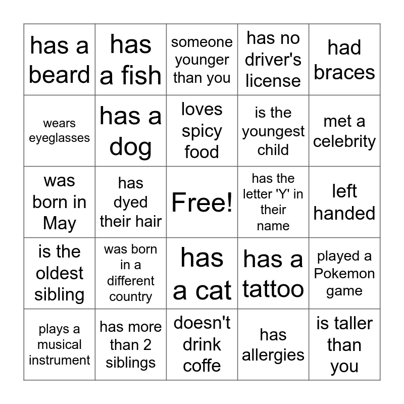 This bingo card has a free space and 24 words: was born in a different country, has more than 2 siblings, loves spicy food, plays a musical instrument, had braces, has a beard, wears eyeglasses, has a fish, has the letter 'Y' in their name, has a cat, is the youngest child, was born in May, has a tattoo, played a Pokemon game, has a dog, has allergies, left handed, someone younger than you, met a celebrity, has dyed their hair, is taller than you, is the oldest sibling, has no driver's license and doesn't drink coffe.