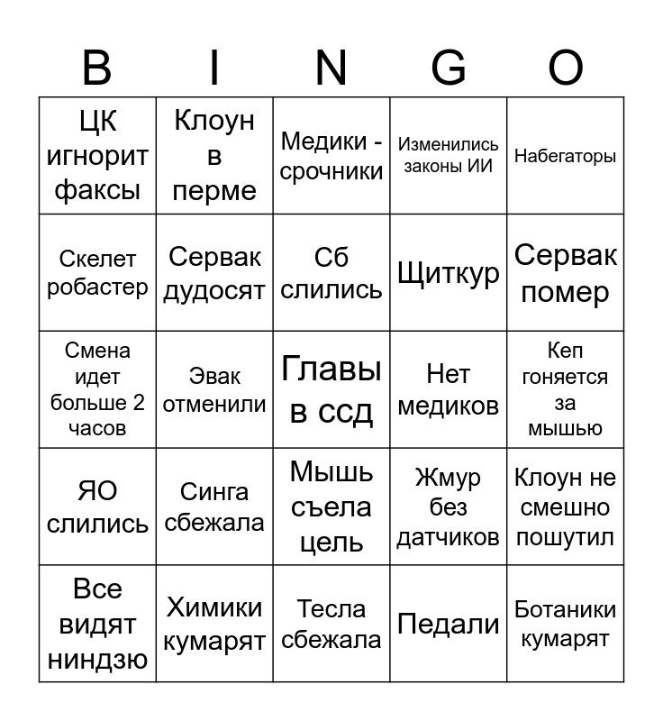 This bingo card has a free space and 24 words: Синга сбежала, Химики кумарят, Сб слились, Все видят ниндзю, Набегаторы, ЦК игнорит факсы, Скелет робастер, Клоун в перме, Нет медиков, Мышь съела цель, Щиткур, Смена идет больше 2 часов, Жмур без датчиков, Клоун не смешно пошутил, Сервак дудосят, Педали, Кеп гоняется за мышью, Медики - срочники, Сервак помер, Эвак отменили, Ботаники кумарят, ЯО слились, Изменились законы ИИ and Тесла сбежала.