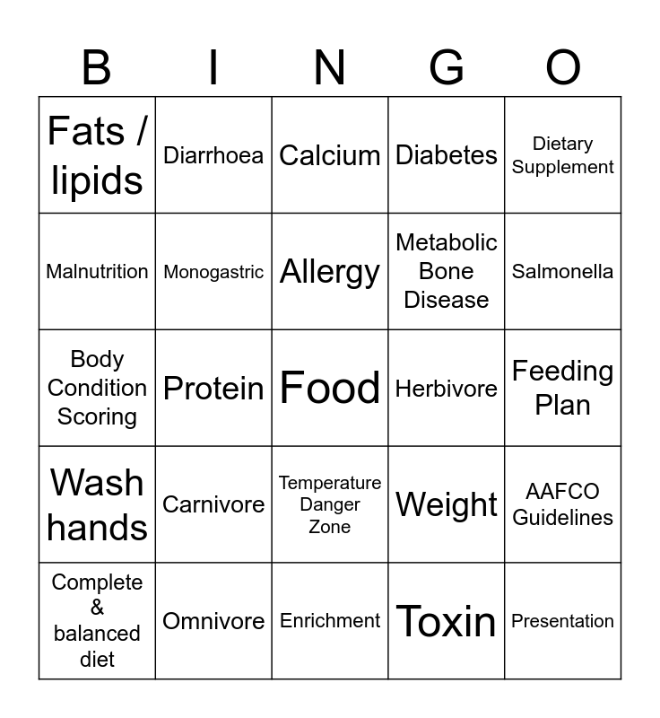 This bingo card has a free space and 29 words: Complete & balanced diet, Water, Protein, Carbohydrate, Fats / lipids, Calcium, Monogastric, Carnivore, Herbivore, Omnivore, Feeding Plan, Presentation, Enrichment, Toxin, Salmonella, Mould, Temperature Danger Zone, Wash hands, Dietary Supplement, Body Condition Scoring, Weight, Pancreatitis, Metabolic Bone Disease, Malnutrition, Diabetes, Diarrhoea, AAFCO Guidelines, Allergy and Inappetance.