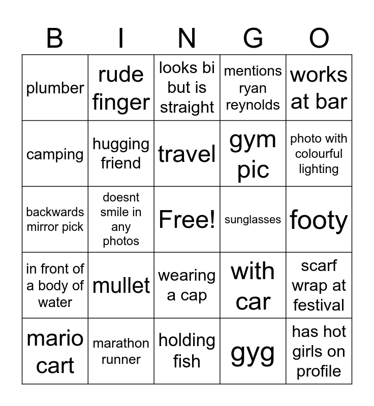 This bingo card has a free space and 25 words: mullet, holding fish, travel, mario cart, works at bar, plumber, camping, rude finger, sunglasses, wearing a cap, gym pic, backwards mirror pick, with car, scarf wrap at festival, hugging friend, skiing, footy, looks bi but is straight, photo with colourful lighting, doesnt smile in any photos, has hot girls on profile, marathon runner, in front of a body of water, mentions ryan reynolds and gyg.