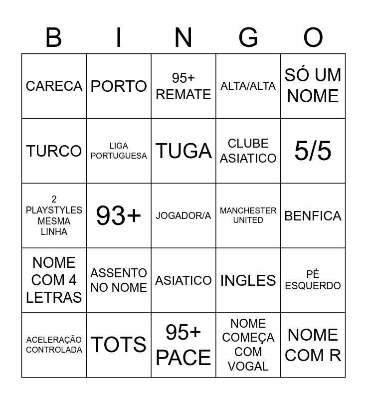 This bingo card has a free space and 30 words: TOTS, LIGA TURCA, 93+, CABELUDO, CARECA, 95+ REMATE, LIGA PORTUGUESA, ASIATICO, MANCHESTER UNITED, 95+ PACE, BENFICA, NOME COM R, NOME COMEÇA COM VOGAL, MENOS DE 175, 5/5, HOLANDES, INGLES, NOME COM 4 LETRAS, ASSENTO NO NOME, SÓ UM NOME, 2 PLAYSTYLES MESMA LINHA, SPORTING, PORTO, CLUBE ASIATICO, TURCO, ALTA/ALTA, PÉ ESQUERDO, ACELERAÇÃO CONTROLADA, TUGA and MAIS DE 2000.