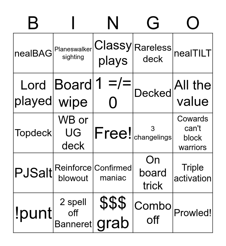 This bingo card has a free space and 24 words: Reinforce blowout, 2 spell off Banneret, 1 =/= 0, !punt, nealTILT, nealBAG, Lord played, Planeswalker sighting, 3 changelings, Confirmed maniac, Decked, Topdeck, On board trick, Triple activation, Board wipe, Combo off, Cowards can't block warriors, Classy plays, All the value, WB or UG deck, Prowled!, PJSalt, Rareless deck and $$$ grab.