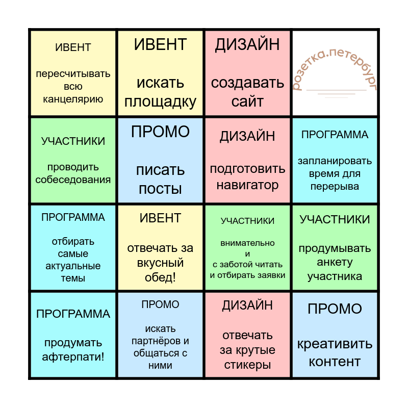 This bingo card has 1 images and 15 words: ПРОМО искать партнёров и общаться с ними, УЧАСТНИКИ продумывать анкету участника, ДИЗАЙН создавать сайт, ИВЕНТ пересчитывать всю канцелярию, ПРОГРАММА отбирать самые актуальные темы, ИВЕНТ искать площадку, УЧАСТНИКИ внимательно и с заботой читать и отбирать заявки, ДИЗАЙН отвечать за крутые стикеры, УЧАСТНИКИ проводить собеседования, ПРОМО писать посты, ПРОГРАММА продумать афтерпати!, ИВЕНТ отвечать за вкусный обед!, ПРОГРАММА запланировать время для перерыва, ДИЗАЙН подготовить навигатор and ПРОМО креативить контент.