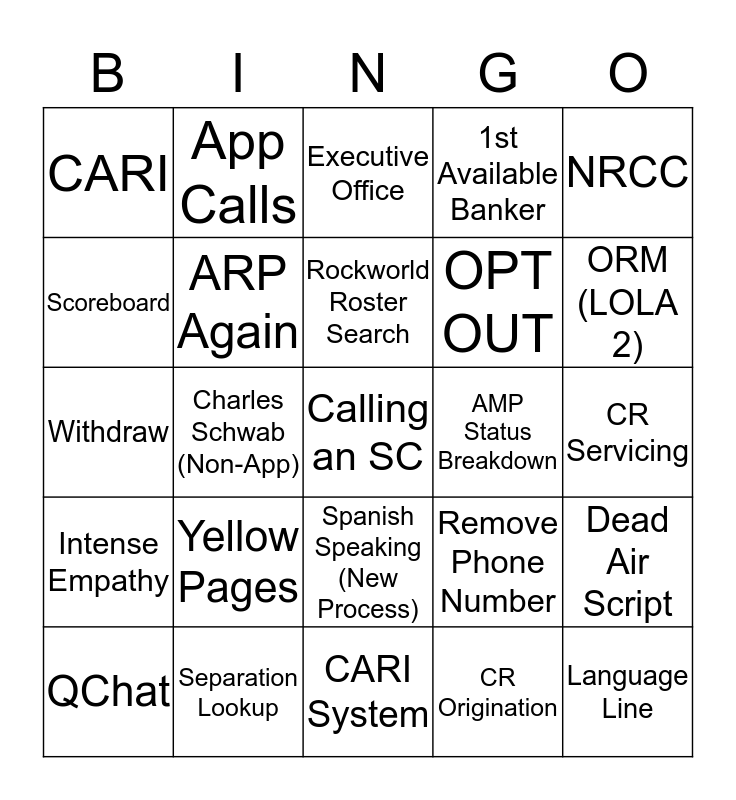 This bingo card has a free space and 24 words: Yellow Pages, Separation Lookup, Rockworld Roster Search, QChat, NRCC, CARI, Scoreboard, App Calls, AMP Status Breakdown, Spanish Speaking (New Process), OPT OUT, Withdraw, Remove Phone Number, Dead Air Script, ARP Again, CR Origination, CR Servicing, Executive Office, ORM (LOLA 2), Charles Schwab (Non-App), Language Line, Intense Empathy, 1st Available Banker and CARI System.