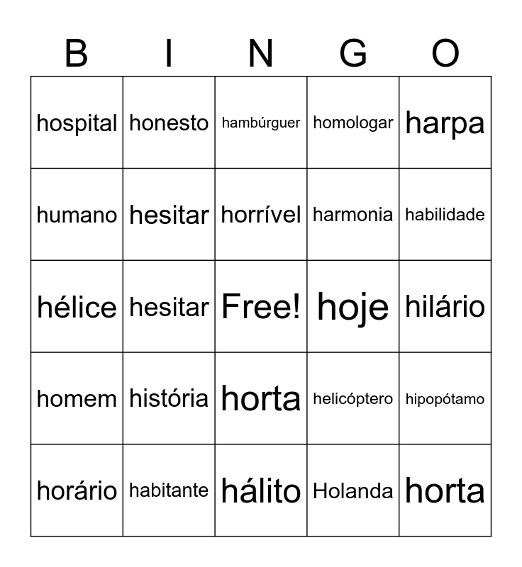 This bingo card has a free space and 24 words: história, habitante, horrível, horário, harpa, hospital, humano, honesto, hoje, horta, harmonia, hélice, helicóptero, hipopótamo, hesitar, Holanda, hilário, hambúrguer, habilidade, hesitar, horta, homem, homologar and hálito.