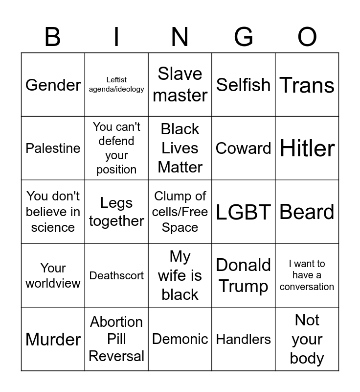 This bingo card has a free space and 24 words: Deathscort, Abortion Pill Reversal, Black Lives Matter, Murder, Trans, Gender, Palestine, Leftist agenda/ideology, LGBT, My wife is black, Coward, You don't believe in science, Donald Trump, I want to have a conversation, You can't defend your position, Handlers, Beard, Slave master, Hitler, Legs together, Not your body, Your worldview, Selfish and Demonic.