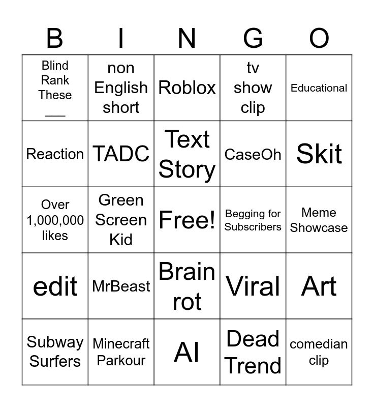 This bingo card has a free space and 24 words: MrBeast, Minecraft Parkour, Text Story, Subway Surfers, Educational, Blind Rank These ___, Reaction, non English short, Begging for Subscribers, Brain rot, CaseOh, Over 1,000,000 likes, Viral, Art, TADC, Dead Trend, Meme Showcase, Roblox, Skit, Green Screen Kid, comedian clip, edit, tv show clip and AI.