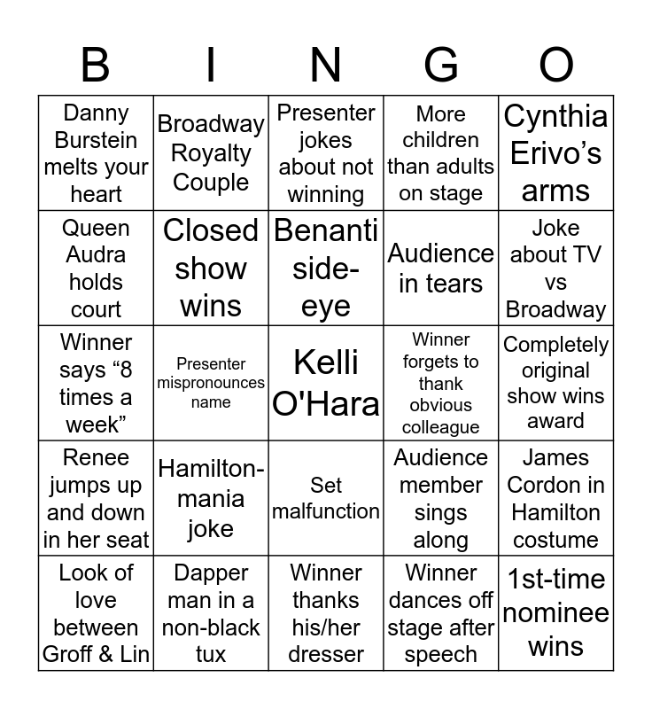 This bingo card has a free space and 24 words: Hamilton- mania joke, Dapper man in a non-black tux, Benanti side-eye, Look of love between Groff & Lin, Cynthia Erivo’s arms, Danny Burstein melts your heart, Queen Audra holds court, Broadway Royalty Couple, Winner forgets to thank obvious colleague, Set malfunction, Audience in tears, Winner says “8 times a week”, Audience member sings along, James Cordon in Hamilton costume, Closed show wins, Winner dances off stage after speech, Completely original show wins award, Presenter jokes about not winning, Joke about TV vs Broadway, Presenter mispronounces name, 1st-time nominee wins, Renee jumps up and down in her seat, More children than adults on stage and Winner thanks his/her dresser.
