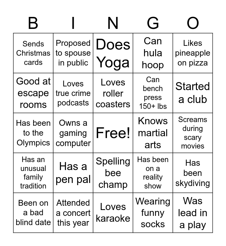 This bingo card has a free space and 33 words: Met a celebrity, Went viral online, Owns a gaming computer, Knows how to surf, Has an unusual family tradition, Loves true crime podcasts, Likes pineapple on pizza, Been on a bad blind date, Proposed to spouse in public, Been to Disney this year, Loves roller coasters, Does Yoga, Can do a cartwheel, Rides horses, Knows martial arts, Started a club, Attended a concert this year, Has been to the Olympics, Has a pen pal, Has been on a reality show, Spelling bee champ, Has been on a road trip, Sends Christmas cards, Screams during scary movies, Loves karaoke, Was lead in a play, Can hula hoop, Can bench press 150+ lbs, Good at escape rooms, Has been skydiving, Won an eating competition, Wearing funny socks and Won at a casino.