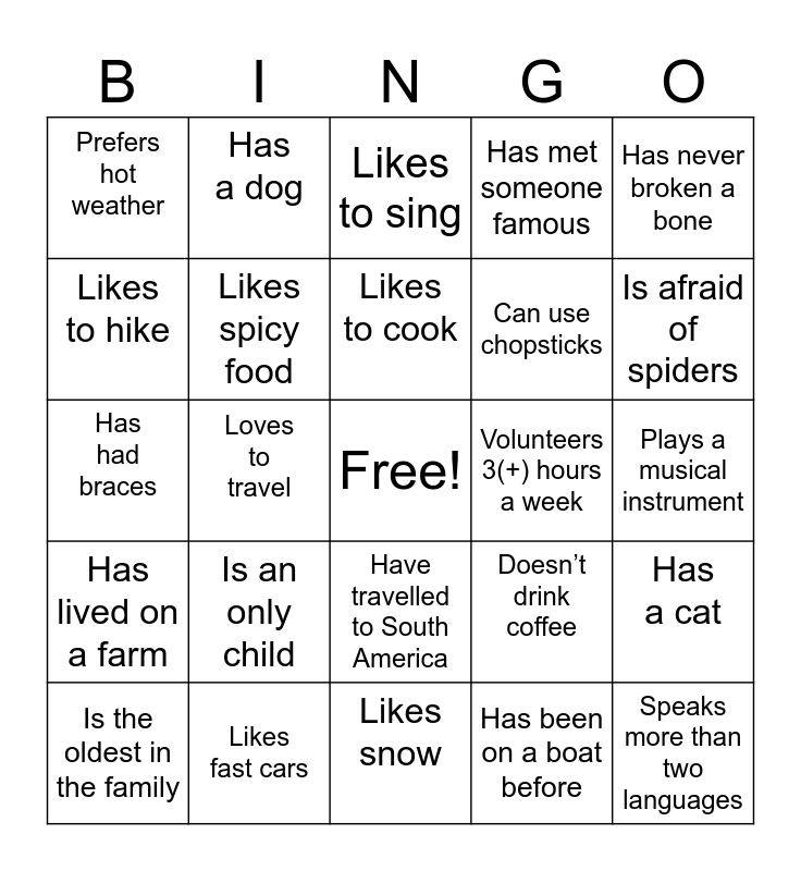 This bingo card has a free space and 29 words: Is the oldest in the family, Likes sports, Loves to travel, Was not born in Canada, Prefers hot weather, Likes to sing, Likes spicy food, Is an only child, Volunteers 3(+) hours a week, Likes fast cars, Plays a musical instrument, Speaks more than two languages, Likes snow, Has been on a boat before, Is afraid of spiders, Likes sushi, Have travelled to South America, Has lived on a farm, Has never broken a bone, Has had braces, Doesn’t drink coffee, Can whistle, Can use chopsticks, Likes to hike, Has met someone famous, Has a dog, Has a cat, Likes to cook and Has been on a cruise.