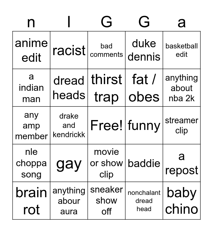 This bingo card has a free space and 24 words: brain rot, gay, thirst trap, nonchalant dread head, basketball edit, anime edit, racist, bad comments, funny, streamer clip, any amp member, dread heads, baddie, a repost, a indian man, anything abour aura, sneaker show off, duke dennis, anything about nba 2k, nle choppa song, drake and kendrickk, movie or show clip, fat / obes and baby chino.