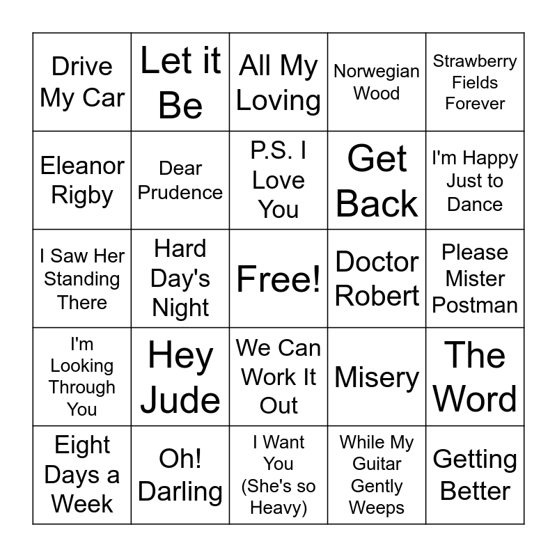 This bingo card has a free space and 84 words: A Day in the Life, Act Naturally, All My Loving, All You Need is Love, And I Love Her, And Your Bird Can Sing, Back in the U.S.S.R., Being for the Benefit of Mr. Kite, Can't Buy Me Love, Carry That Weight, Come Together, Day Tripper, Dear Prudence, Doctor Robert, Don't Let Me Down, Drive My Car, Eight Days a Week, Eleanor Rigby, Fixing a Hole, Fool on the Hill, For no One, Get Back, Getting Better, Got to Get You Into my Life, Hard Day's Night, Hello, Goodbye, Help!, Helter Skelter, Here Comes the Sun, Hey Bulldog, Hey Jude, I Am the Walrus, I Need You, I Saw Her Standing There, I Should have Known Better, I Want to Hold Your Hand, I Want You (She's so Heavy), I Will, I'm Happy Just to Dance, I'm Looking Through You, I've Just Seen a Face, If I Fell, If I Needed Someone, In My Life, It Won't Be Long, It's Only Love, Let it Be, Love Me Do, Lovely Rita, Lucy in the Sky with Diamonds, Magical Mystery Tour, Misery, Norwegian Wood, Nowhere Man, Ob-La-Di, Ob-La-Da, Octopus's Garden, Oh! Darling, P.S. I Love You, Penny Lane, Please Mister Postman, Please Please Me, Rocky Racoon, Roll Over Beethoven, Sgt. Pepper's Lonely Hearts Club Band, She Came in Through the Bathroom Window, She Loves You, She Said She Said, Something, Strawberry Fields Forever, Taxman, The Word, Ticket to Ride, Twist and Shout, Two of Us, We Can Work It Out, While My Guitar Gently Weeps, With a Little Help from My Friends, Yellow Submarine, Yesterday, You're Going to Lose That Girl, A Day in the Life, A Day in the Life, A Day in the Life and A Day in the Life.