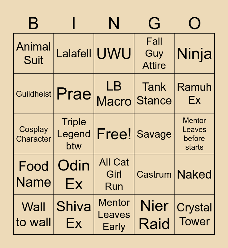 This bingo card has a free space and 24 words: Odin Ex, Shiva Ex, LB Macro, Wall to wall, Ninja, Animal Suit, Guildheist, Lalafell, Savage, All Cat Girl Run, Tank Stance, Cosplay Character, Castrum, Naked, Prae, Nier Raid, Mentor Leaves before starts, UWU, Ramuh Ex, Triple Legend btw, Crystal Tower, Food Name, Fall Guy Attire and Mentor Leaves Early.