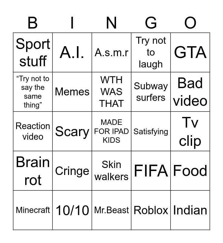 This bingo card has a free space and 24 words: Cringe, 10/10, WTH WAS THAT, Minecraft, GTA, Sport stuff, “Try not to say the same thing”, A.I., Satisfying, Skin walkers, Subway surfers, Reaction video, FIFA, Food, Memes, Roblox, Tv clip, A.s.m.r, Bad video, Scary, Indian, Brain rot, Try not to laugh and Mr.Beast.