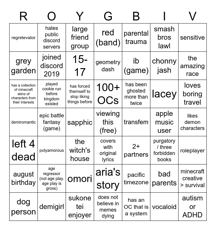 This bingo card has a free space and 48 words: pacific timezone, chonny jash, does not believe in memes dying, epic battle fantasy (game), has forced themself to stop liking things before, likes demon characters, hates public discord servers, demigirl, smash bros lawl, covers with original lyrics, sensitive, red (band), lacey, has been ghosted more than twice, august birthday, apple music user, grey garden, the amazing race, bad parents, parental trauma, ib (game), sapphic, regretevator, joined discord 2019, minecraft creative > survival, 15-17, loves boring travel, dog person, 100+ OCs, played cookie run before kingdom existed, vocaloid, transfem, roleplayer, age regressor (not age play. age play is gross), demiromantic, 2+ partners, purgatory / three forbidden books, has a collection of minecraft skins of characters from their interests, the witch's house, omori, left 4 dead, autism or ADHD, large friend group, sukone tei enjoyer, geometry dash, aria's story, polyamorous and has an OC that is a system.