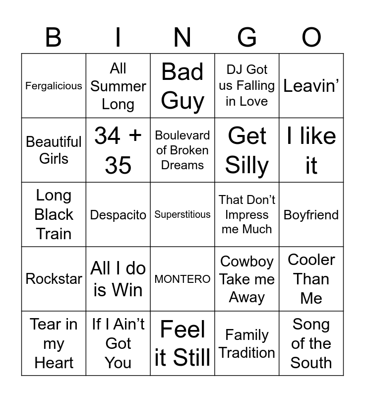This bingo card has 50 words: Free!, Superstitious, Super Freak, Feel it Still, All I do is Win, Always be my Baby, All Summer Long, The Boys are Back in Town, Beautiful Girls, Red Solo Cup, 34 + 35, DJ Got us Falling in Love, Cooler Than Me, Cowboy Take me Away, Ignition, Write This Down, Boulevard of Broken Dreams, That Don’t Impress me Much, I’m Comin Out, Leavin’, Despacito, Family Tradition, Fergalicious, Get Silly, I Knew You Were Trouble, Song of the South, I like it, Best Song Ever, Bad Guy, MONTERO, Build me up Buttercup, Your Man, Do You Believe in Life After Love, Wagon Wheel, If I Ain’t Got You, I Love This Bar, Toxic, Honky Tonk Badonkadonk, Misery Business, Boyfriend, Marry You, Paparazzi, Versace on the Floor, Waka Waka, Tear in my Heart, Long Black Train, T.N.T, Paradise City, Rockstar and Pretty Good at Drinking Beer.