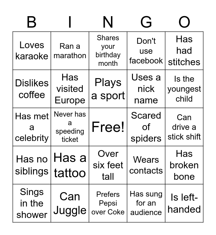 This bingo card has a free space and 24 words: Has a tattoo, Can Juggle, Plays a sport, Sings in the shower, Has had stitches, Loves karaoke, Dislikes coffee, Ran a marathon, Scared of spiders, Over six feet tall, Uses a nick name, Has met a celebrity, Wears contacts, Has broken bone, Has visited Europe, Has sung for an audience, Can drive a stick shift, Shares your birthday month, Is the youngest child, Never has a speeding ticket, Is left-handed, Has no siblings, Don't use facebook and Prefers Pepsi over Coke.