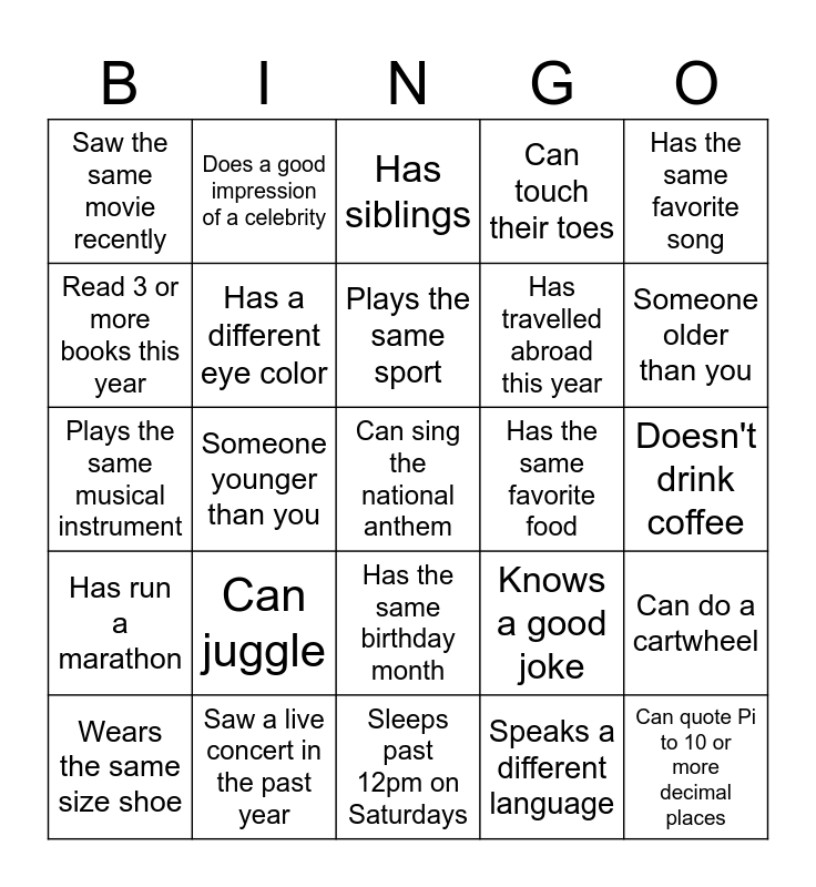 This bingo card has a free space and 24 words: Can juggle, Saw a live concert in the past year, Plays the same sport, Wears the same size shoe, Has the same favorite song, Saw the same movie recently, Read 3 or more books this year, Does a good impression of a celebrity, Has the same favorite food, Has the same birthday month, Has travelled abroad this year, Plays the same musical instrument, Knows a good joke, Can do a cartwheel, Has a different eye color, Speaks a different language, Doesn't drink coffee, Has siblings, Someone older than you, Someone younger than you, Can quote Pi to 10 or more decimal places, Has run a marathon, Can touch their toes and Sleeps past 12pm on Saturdays.