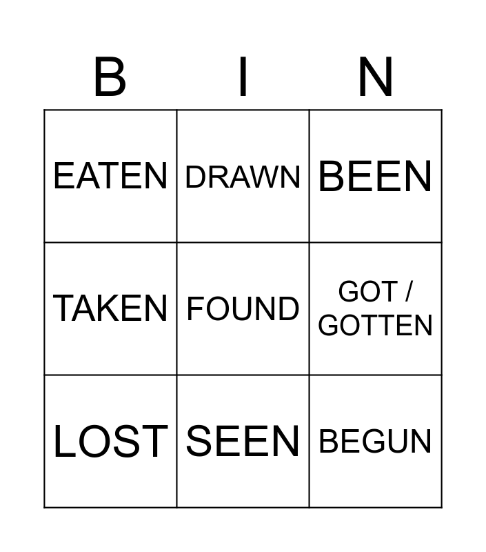 This bingo card has a free space and 20 words: MADE, GONE, BEEN, RIDDEN, HAD, BEGUN, DRUNK, EATEN, FOUGHT, DRAWN, COME, DRIVEN, GOT / GOTTEN, KNOWN, LOST, MET, SEEN, TAKEN, TOLD and TAUGHT.