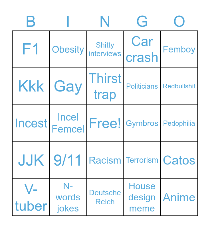 This bingo card has a free space and 24 words: 9/11, N-words jokes, Thirst trap, V-tuber, Femboy, F1, Kkk, Obesity, Gymbros, Racism, Politicians, Incest, Terrorism, Catos, Gay, House design meme, Pedophilia, Shitty interviews, Redbullshit, Incel Femcel, Anime, JJK, Car crash and Deutsche Reich.