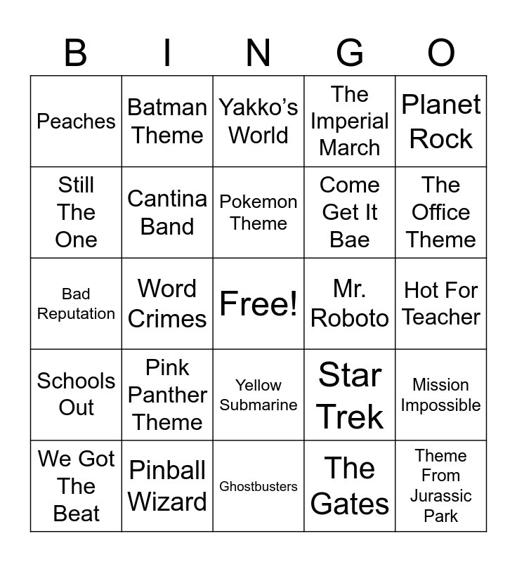 This bingo card has a free space and 50 words: Basket Case, Theme From Jurassic Park, Star Wars, Ghostbusters, Pink Panther Theme, Big Bang Theory, Batman Theme, White & Nerdy, Still The One, The Lone Ranger, Cantina Band, The Imperial March, Mission Impossible, Star Trek, Last Jedi Knights, Travelin Man, Pokemon Theme, Mr. Roboto, Don’t Bring Me Down, Planet Rock, Word Crimes, The Gates, Peaches, Come Get It Bae, Attention, Edge Of Seventeen, The Office Theme, You’re The Best, Yakko’s World, Yellow Submarine, Dude, Summer Of 69, Another One Bites The Dust, Thunderstruck, Pinball Wizard, The Joker, Abracadabra, Whip It, Video Killed The Radio Star, Hot For Teacher, Our House, Good Time Roll, Radio Ga Ga, The Rubberband Man, We Got The Beat, Bad Reputation, Eye Of The Tiger, 1985, Schools Out and The Longest Time.
